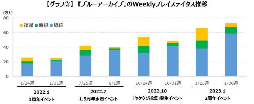 一方で、今回行われた2周年イベントでは、WAUは1月30日週で72.6万人と、リリース時期の最大WAUの約1.4倍となっています。1周年イベント時と比べると、WAUは約2.7倍となっています。【グラフ③】