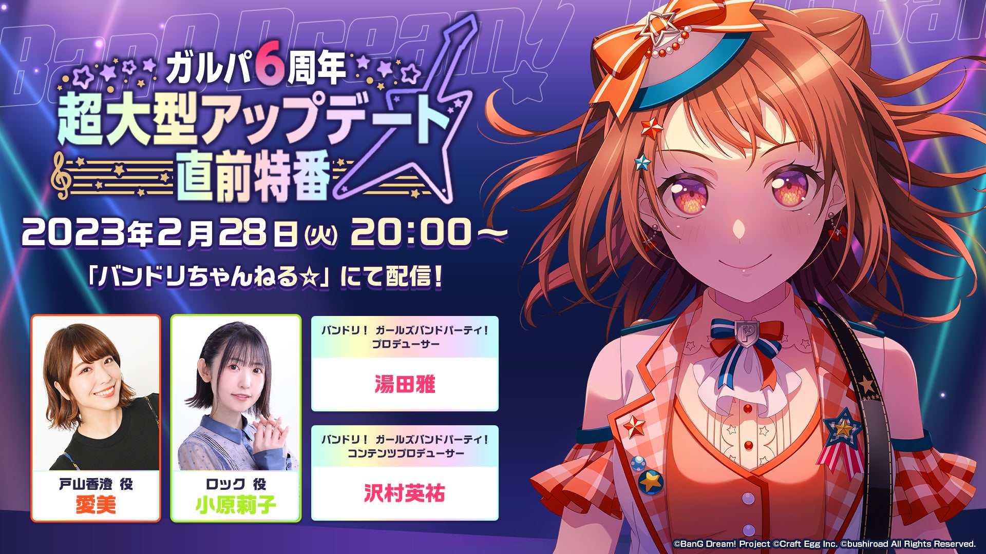 株式会社Craft Egg(本社:東京都渋谷区 代表取締役:森川 修一、以下、Craft Egg)と、株式会社ブシロード(本社:東京都中野区 代表取締役社長:木谷 高明、以下、ブシロード)の共同制作によるスマートフォン向けゲーム「バンドリ! ガールズバンドパーティ!」(以下、ガルパ)は、2023年2月28日(火)20時より配信の「ガルパ6周年超大型アップデート直前特番」にて、ガルパの6周年キャンペーン情報や、3月16日(木)より登場する新レアリティ★5メンバーを発表いたします。また、バンドリ!プロジェクトの新情報なども発表いたします。ぜひご覧ください。