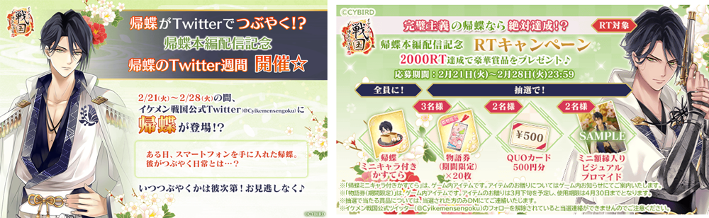 『イケメン戦国◆時をかける恋』公式Twitterでは、「帰蝶(CV:梶裕貴)」本編配信を記念した「RTキャンペーン」や「帰蝶のTwitter週間」を開催します。