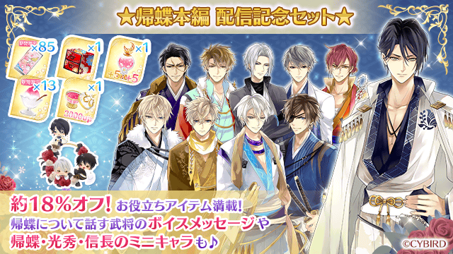 さらに、本編ストーリーを読み進めるためのアイテムがたっぷり入った「帰蝶本編配信記念セット」も販売中です。「帰蝶(CV:梶裕貴)」について話す他武将のボイスメッセージや、「帰蝶・光秀・信長」の集合ミニキャラも入った豪華なセットなので、お見逃しなく。