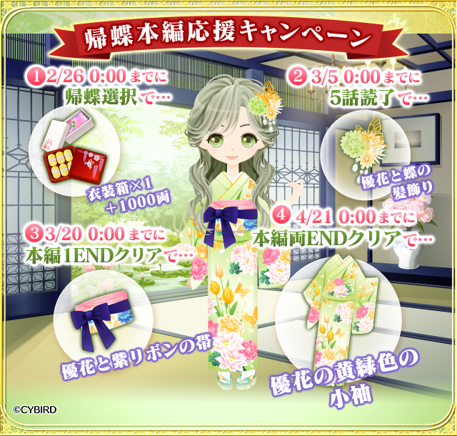 キャンペーン期間中に「帰蝶(CV:梶裕貴)」本編ストーリーを読み進めると、ゲーム内で使えるアイテムや限定アバターアイテムが獲得できます。