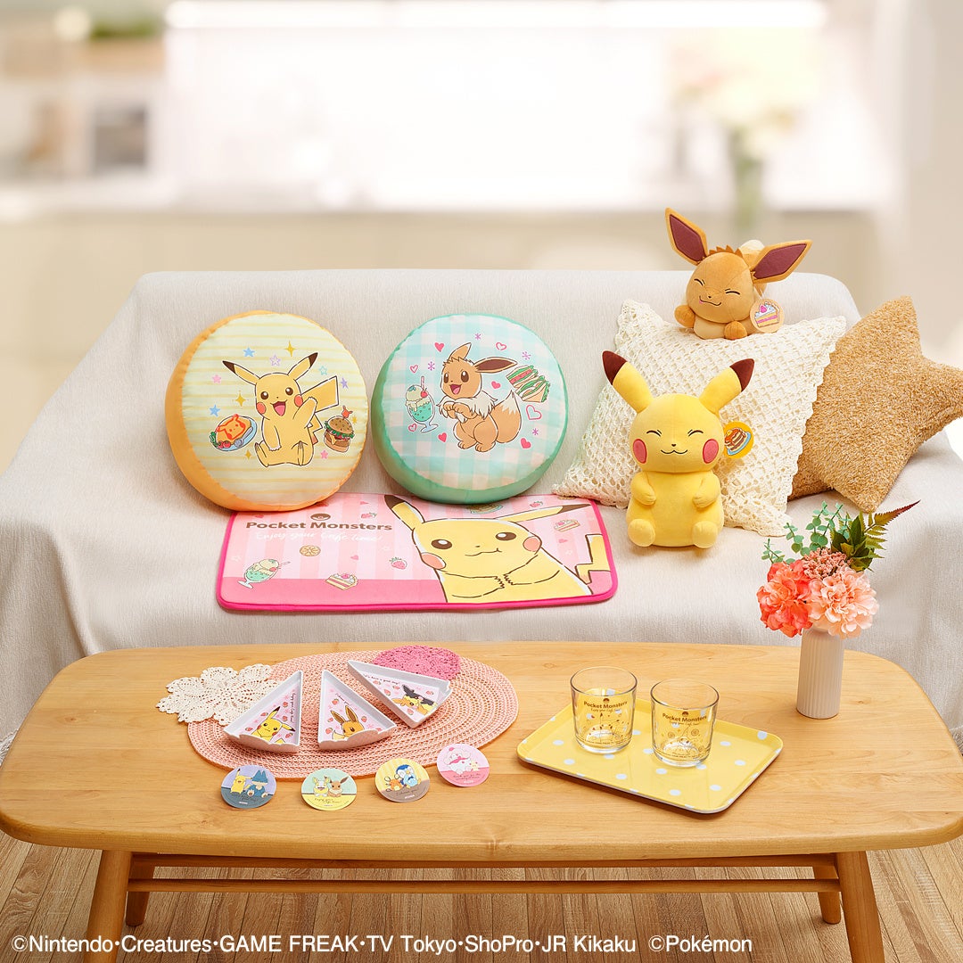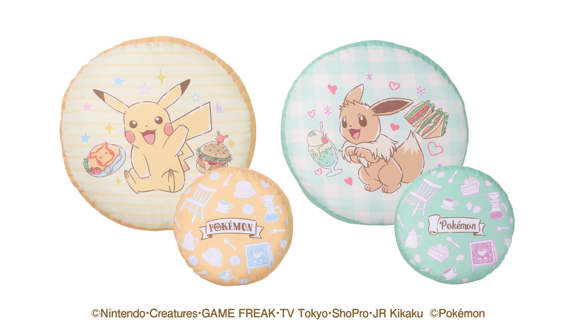 キャンペーン期間中には、「ナムコくじ」の賞品と同じ淡い色味のピカチュウとイーブイのぬいぐるみやクッションが登場します。
