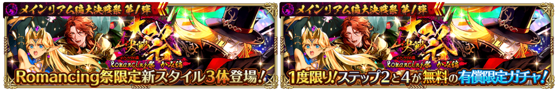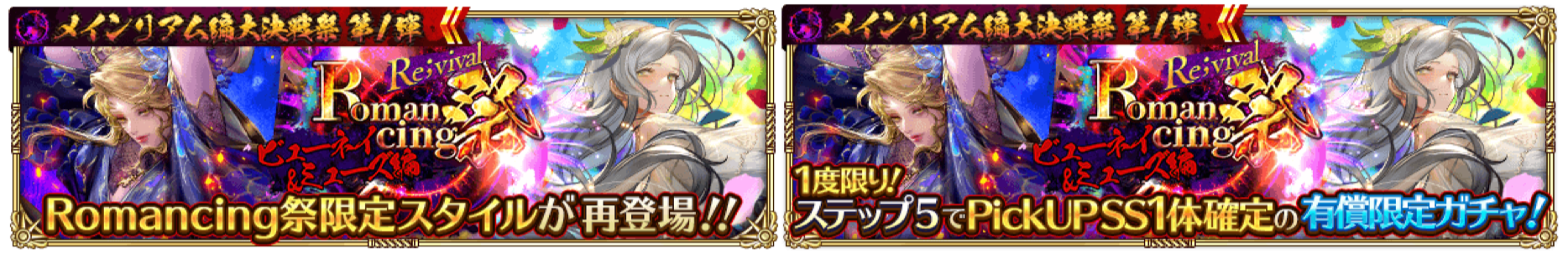 Romancing祭限定スタイルの中から2つのスタイルが再登場&PickUPした「Romancing祭Re;vival ビューネイ&ミューズ編」を開催いたします。本ガチャでは、通常ガチャと有償ジュエルで実行できるステップガチャの2種類をご用意しております。