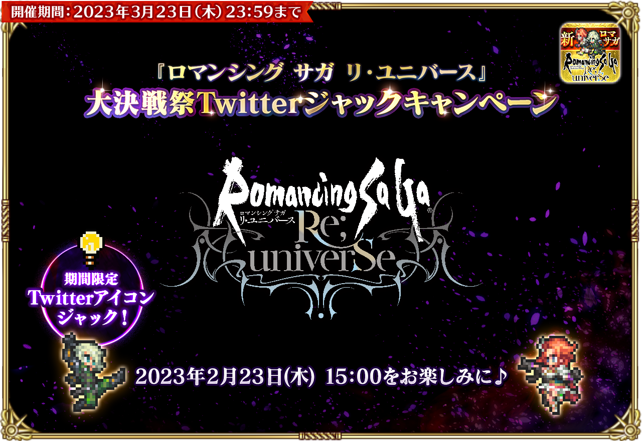 あなたのTwitterアイコンが『ロマンシング サガ リ・ユニバース』のキャラクターに期間限定でジャックされる、『ロマンシング サガ リ・ユニバース』大決戦祭Twitterジャックキャンペーンを開催します。