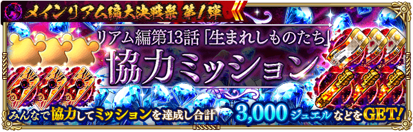 全体ミッションでは合計3,000ジュエル、個人ミッションではメインリアム編大決戦祭 プラチナチケット[期間限定]などの報酬が獲得できます。