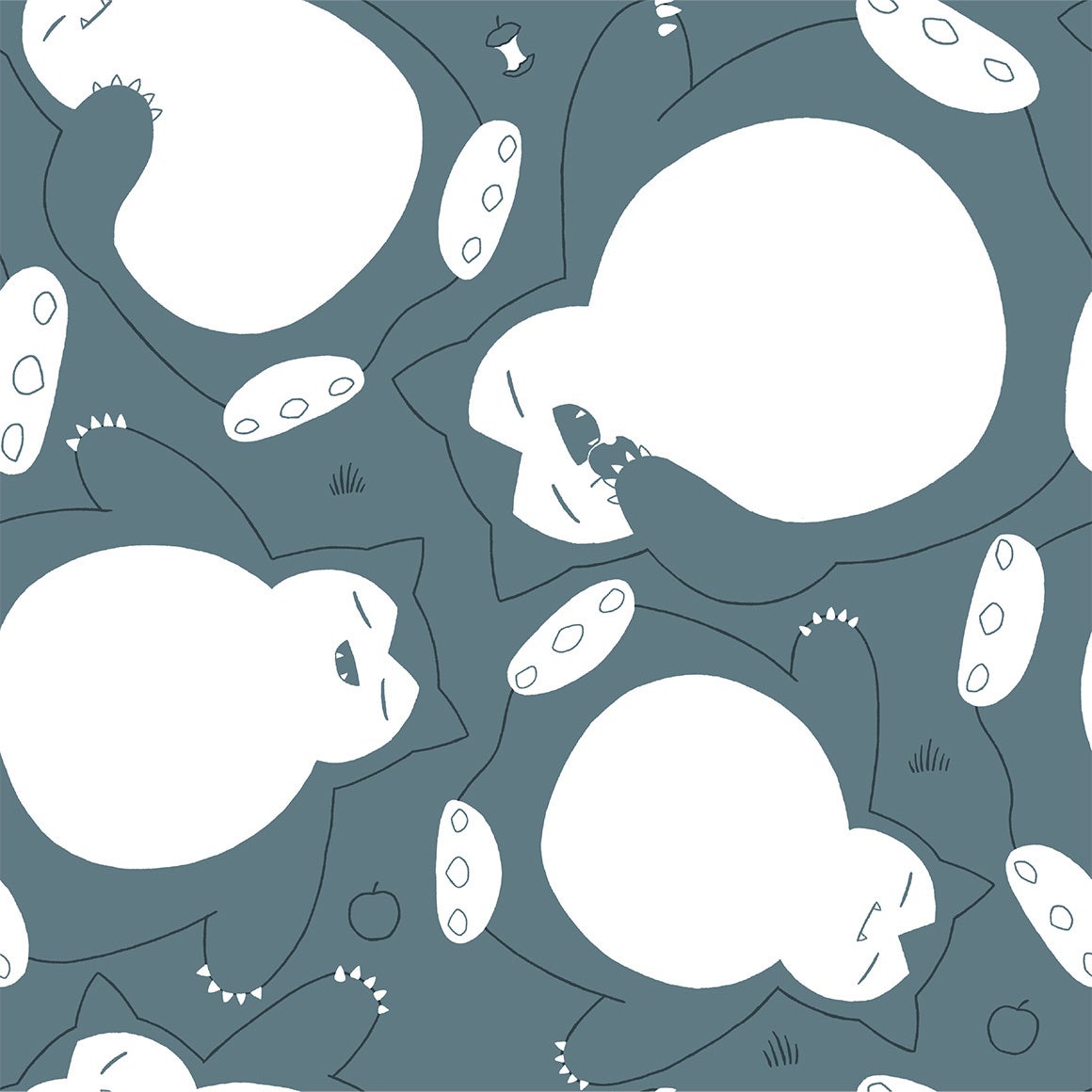 「食べて寝ての繰り返しで1日が終わる」カビゴン。原っぱの上で寝転がる様子は、まるで大きな水玉柄。近くに落ちている食べ物を拾って、「食うか寝るかしかしていない」ようだ。