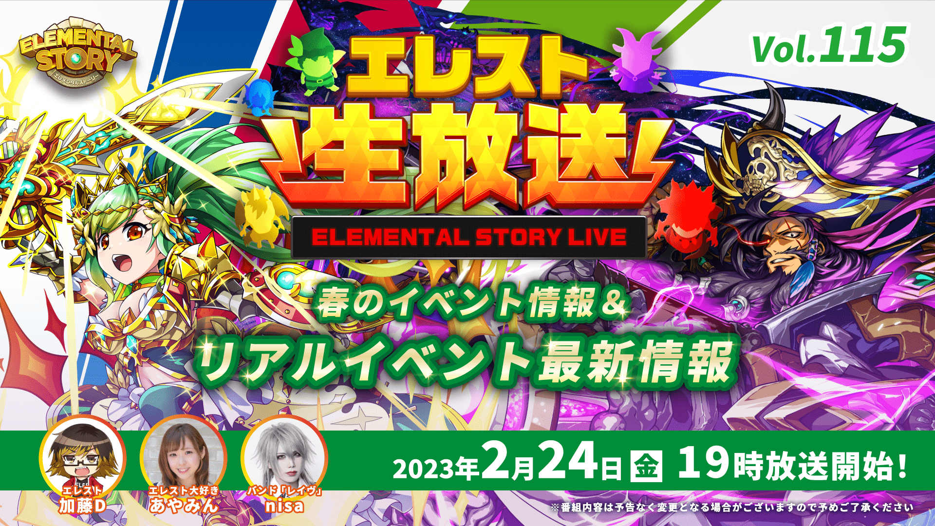 StudioZ株式会社(本社:東京都港区 代表取締役CEO:池幡 賢)が運営しております 共闘対戦 爽快パズル消しゲー『エレメンタルストーリー』は、2023年2月24日(金)19:00より、StudioZ公式エレスト生放送vol.115を配信いたします。