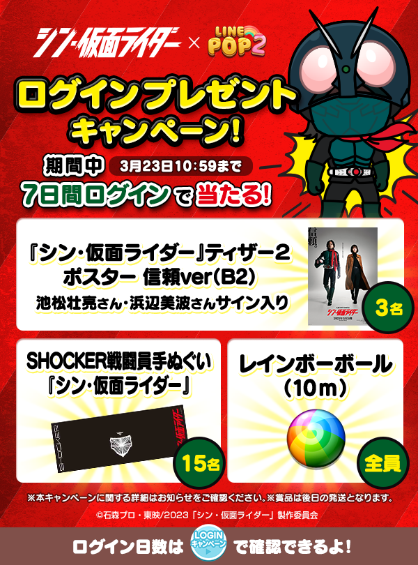 キャンペーン期間中に7日間ログインされた方全員にゲーム内アイテム「レインボーボール(10m)」をプレゼントするほか、抽選で映画『シン・仮面ライダー』に出演の池松壮亮さんと浜辺美波さんのサイン入りポスターが当たるキャンペーンを開催します。