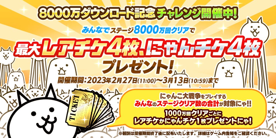 期間中、みんなでステージを1000万回クリアするごとににゃんこチケットかレアチケットを1枚プレゼントするチャレンジイベントが登場!