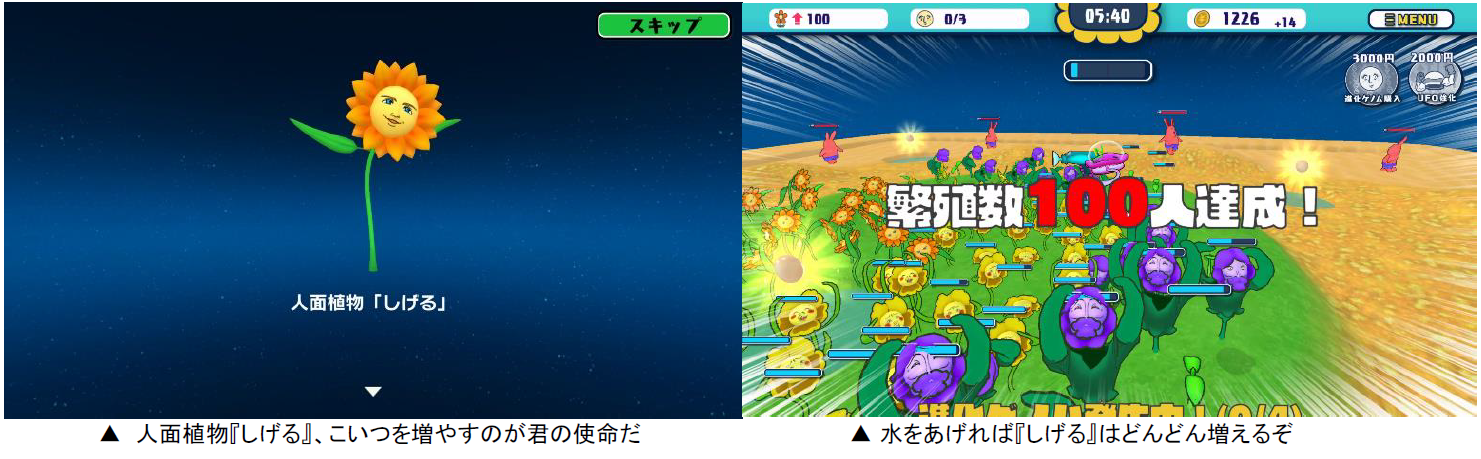 プレイヤーはUFOに乗って空中から人面植物『しげる』に水をあげよう!