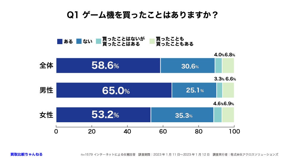 男女別に見ると、ゲーム機を買ったことがある男性は65%、女性は53.2%いることが分かりました。