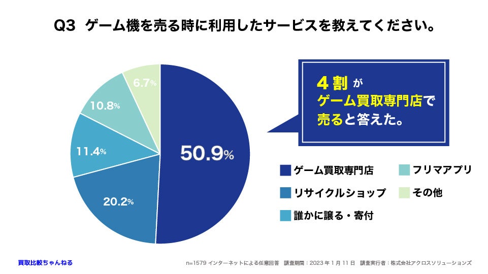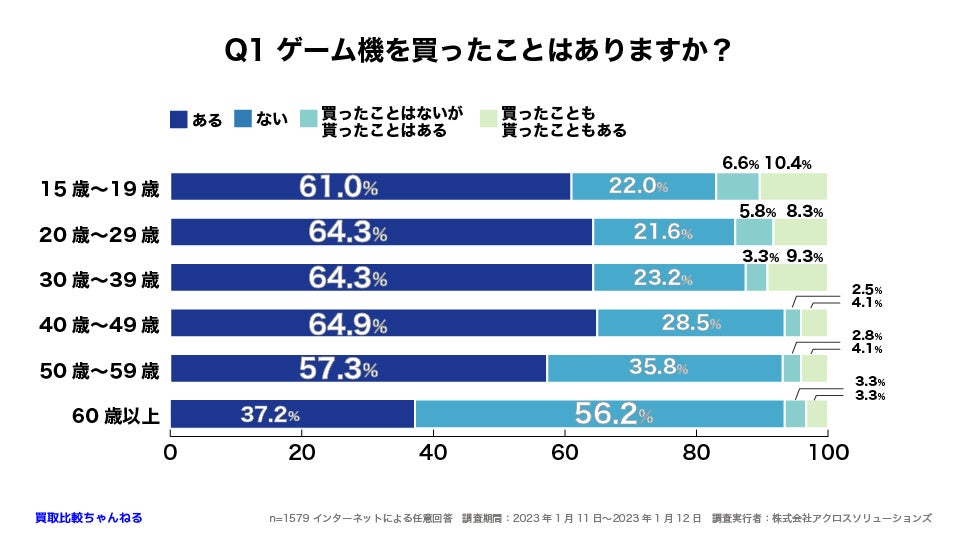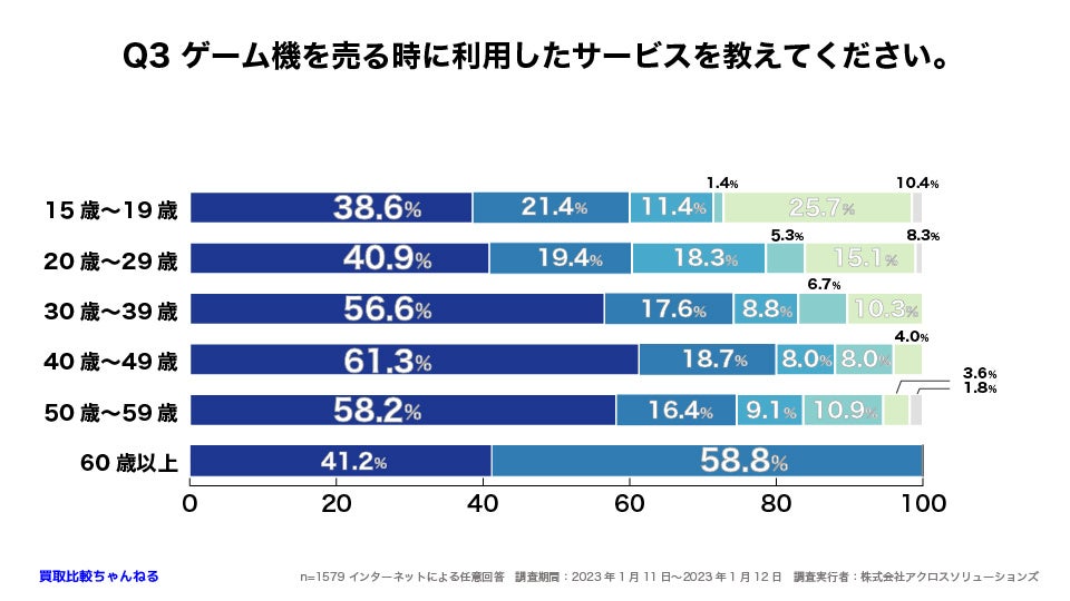 株式会社アクロスソリューションズと株式会社浜屋が共同運営している買取比較ちゃんねる(URL:https://www.hamaya-corp.co.jp/media )は、15歳〜60歳以上の男女1579人を対象に「ゲーム機を売るときに利用するサービスに関する意識調査」を実施しました。