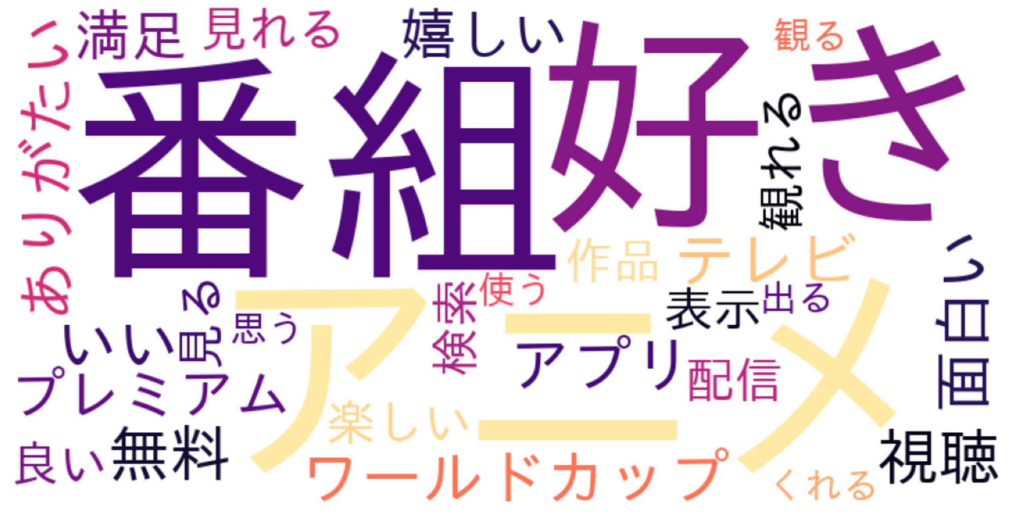 ABEMAのGoogle PlayとApp Storeのユーザーレビューのテキストから登場頻度が高いキーワードをまとめたワードクラウドからは、コンテンツの種類やその楽しさ、さらに注目が集まったワールドカップの文言が頻出しました。