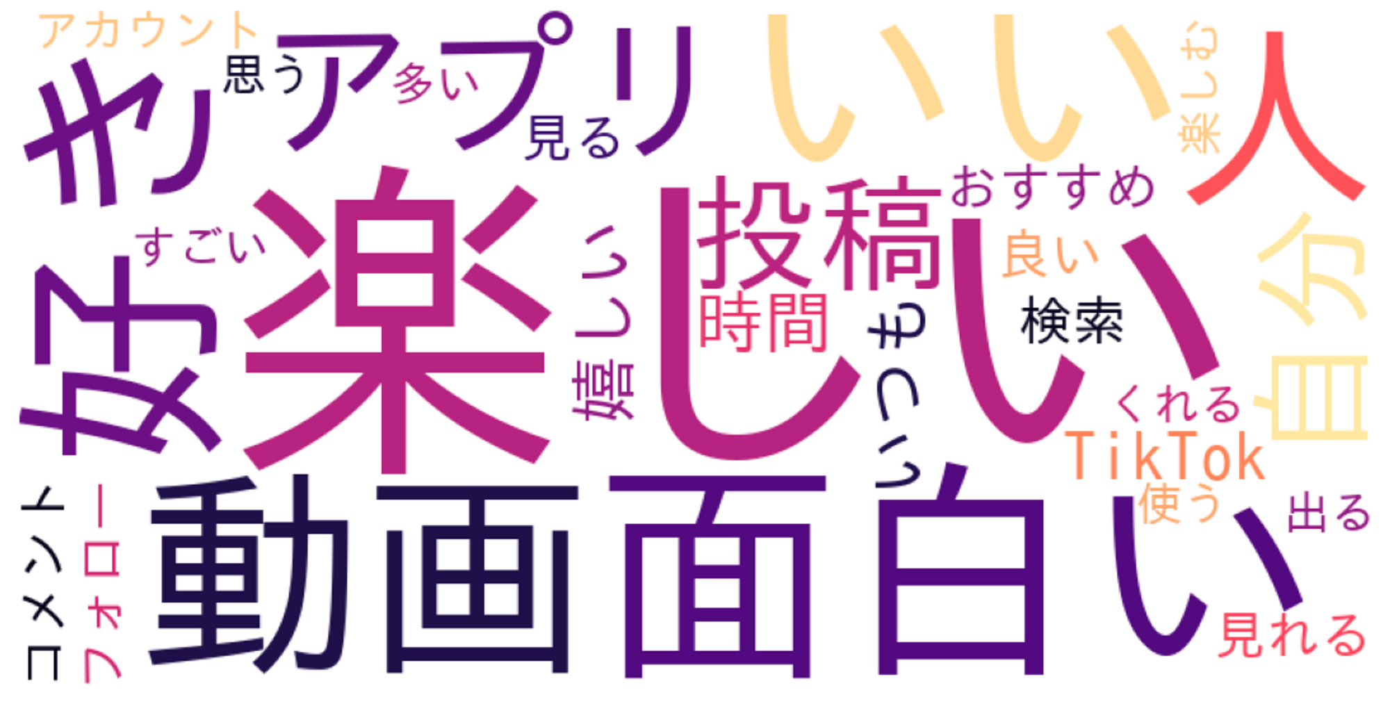 TikTokのGoogle PlayとApp Storeのユーザーレビューのテキストから登場頻度が高いキーワードをまとめたワードクラウド(ポジティブな感情を想起するキーワードを抽出。以下、全てのアプリにおいて同じ条件で分析を実施)からも「楽しい」「面白い」「好き」といったユーザーの熱中度を反映したキーワードが多く見られました。