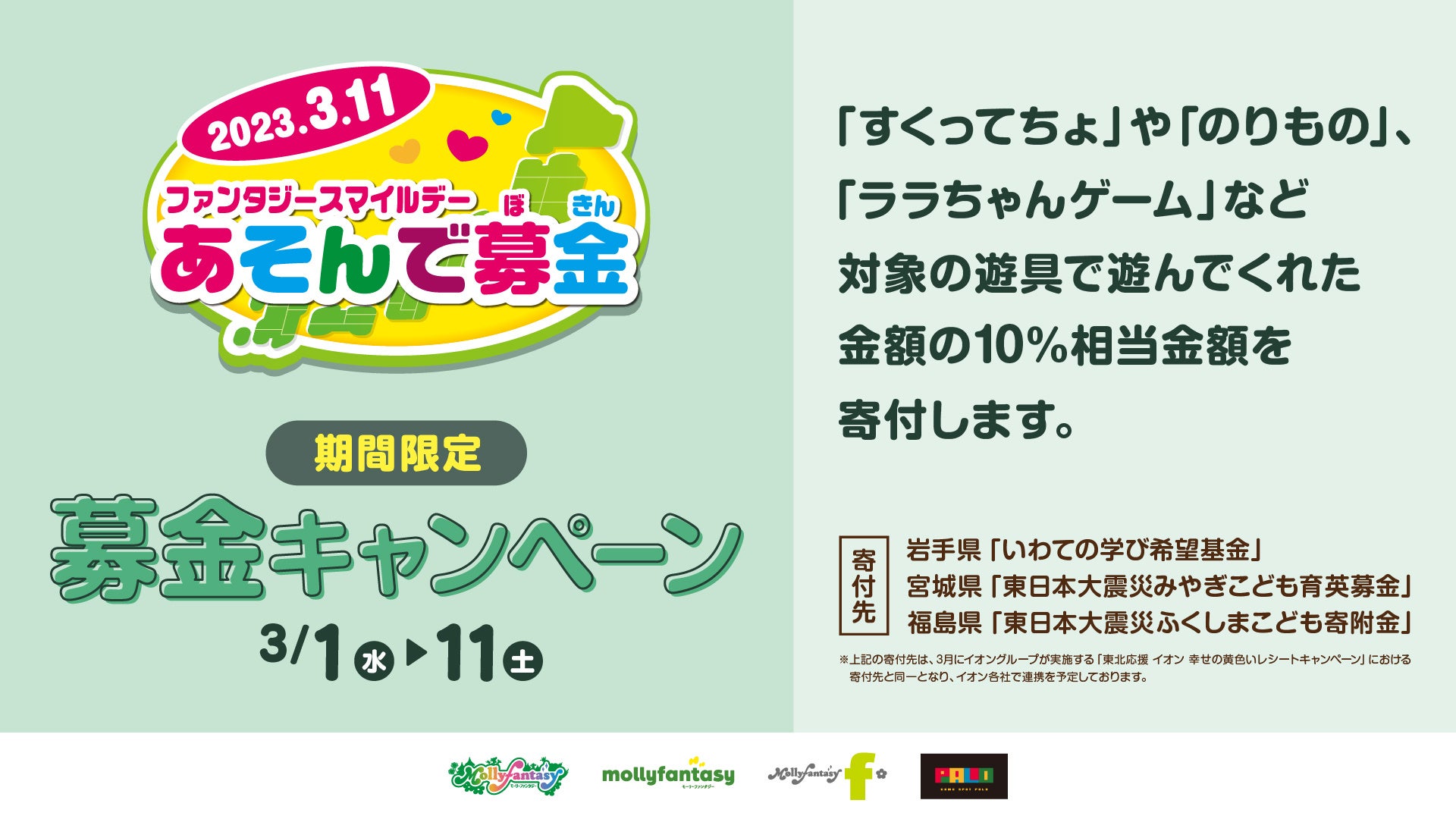 株式会社イオンファンタジー(本社:千葉県千葉市、代表取締役社長:藤原徳也、以下、当社)は、3月1日(水)から3月11日(土)までの期間、モーリーファンタジー・PALOなどの当社アミューズメント施設の対象機種で遊んでいただいた売上の一部を復興支援活動や子ども支援活動、環境保全活動に役立てる「拡大あそんで募金」を全国421店舗で開催いたします。