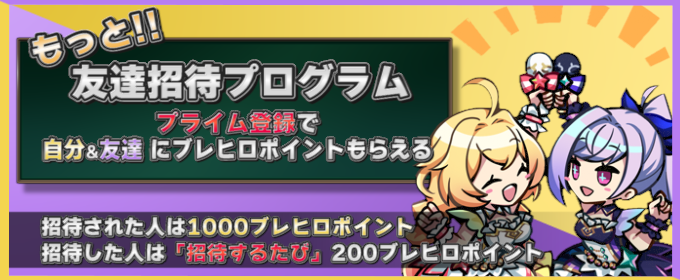 招待コードを使用してゲームを開始したお友達が召喚師育成プログラムに加入した時、招待した人に200ブレヒロポイント、招待コードを使用したお友達に1000ブレヒロポイントが配布されます。