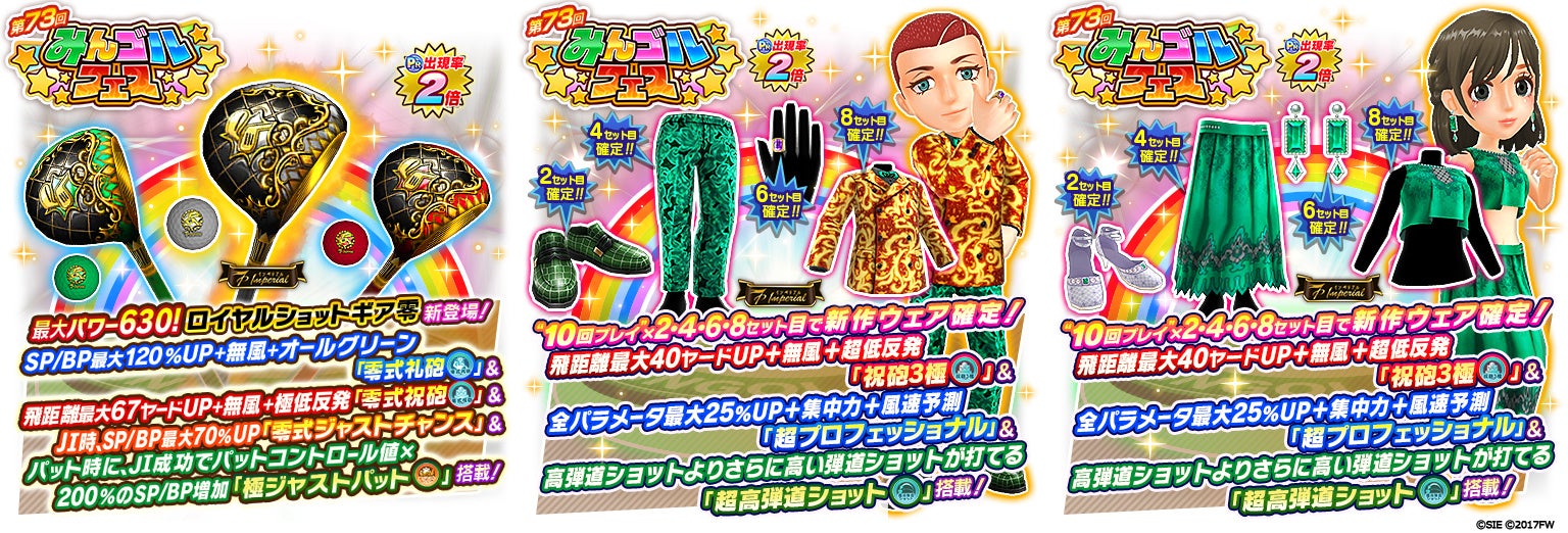 今回のギアガチャには、Imperialシリーズより最大パワー630を誇る、ロイヤルショットギア零が新登場!ウェアガチャには「飛距離最大40ヤードUP」+「無風」+「超低反発」効果のアクティブスキル「祝砲3極」など複数スキルを搭載した新作ウェアが登場。さらに「10回プレイ」2・4・6・8セット目で新作ウェアが確定となります。ぜひ、ご参加ください!