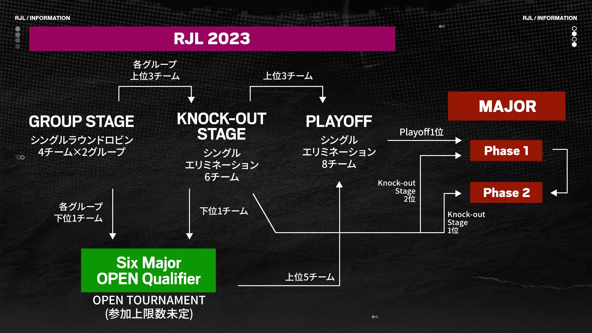 計8チームにて行う「Group Stage」「Knock-out Stage」「Playoff」の流れを1Seasonとし、計2Season開催。各Season後に控える世界大会「Six Major」に参加する日本代表3チームを選出します。