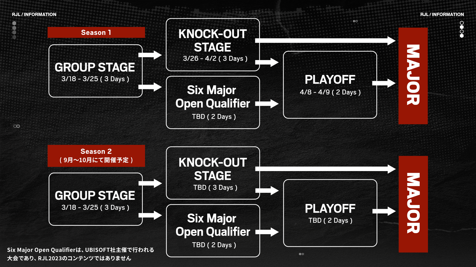 計8チームにて行う「Group Stage」「Knock-out Stage」「Playoff」の流れを1Seasonとし、計2Season開催。各Season後に控える世界大会「Six Major」に参加する日本代表3チームを選出します。