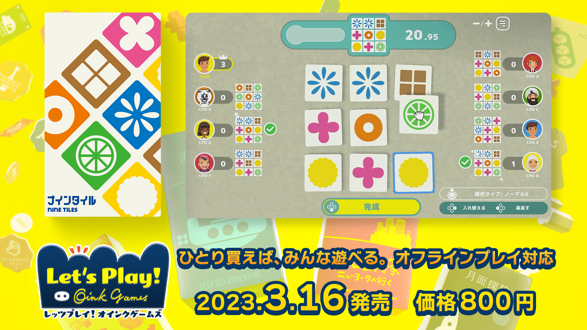 ボードゲームやデジタルゲームの開発を手がける株式会社オインクゲームズは、同社が開発するNintendo Switch/Steam/スマホ向けゲーム「レッツプレイ!オインクゲームズ」内で遊べるボードゲームに、2023年3月16日、「ナインタイル」を有料DLCとして追加することを発表しました。DLCの価格は800円です。