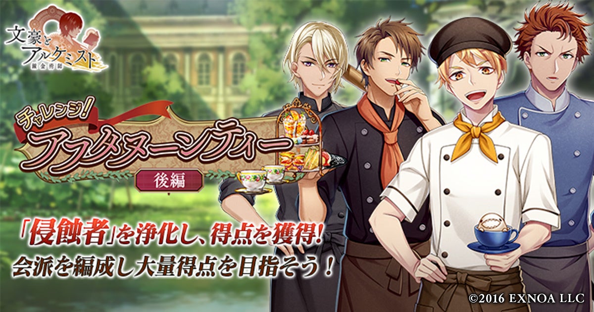 合同会社EXNOA(本社:東京都港区、CEO:村中 悠介、URL:https://games.dmm.com/)が運営するDMM GAMESは、3月1日(水)より、女性向け文豪転生シミュレーションゲーム「文豪とアルケミスト」において、イベント『調査任務「チャレンジ!アフタヌーンティー 後編」』と限定召装『チャレンジ!アフタヌーンティー 後編』を開催いたしました。