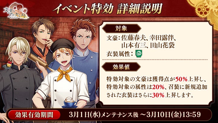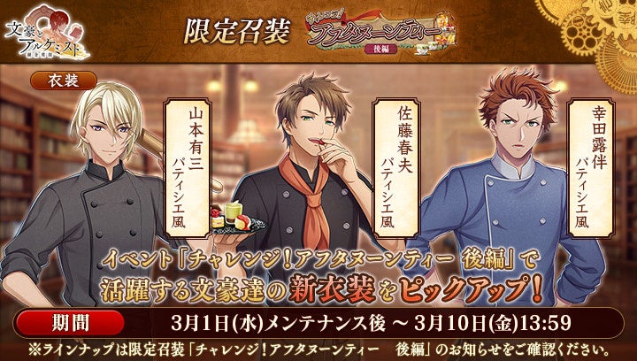 さらに、イベントと同時に開催される限定召装『チャレンジ!アフタヌーンティー 後編』にて新規追加された「山本有三」「佐藤春夫」「幸田露伴」の〈パティシエ風〉を編成すると、得点の獲得率がそれぞれ30%上昇します。