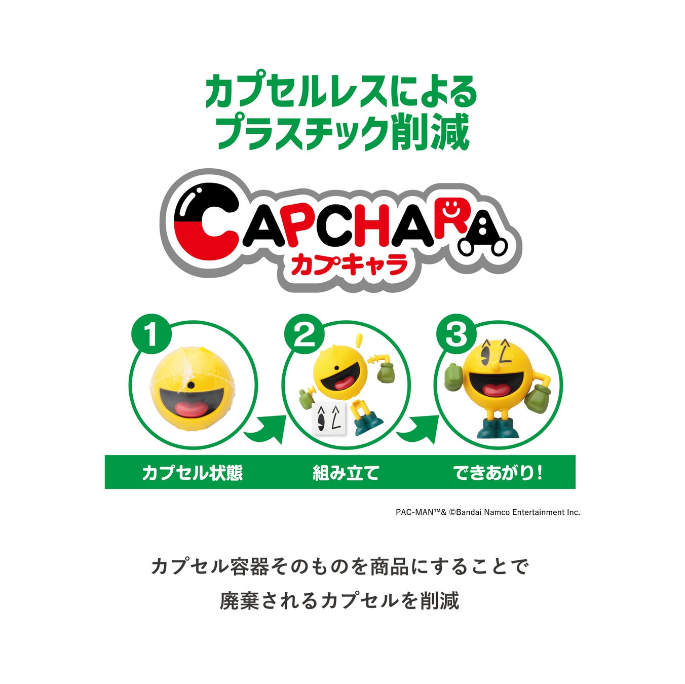 本パビリオンで、子どもたちは体験の最初に、使用済となった「カプセルトイ」のカプセルを回収・再利用し、環境に配慮した商品がつくられていることを学びます。また「おもちゃ工場スタッフ」として、空カプセルをリサイクルした 「リサイクル ペレット※1 」を材料の一部に用い、機械による成形や塗装の工程を経て、キッザニア限定カラーの 「パックマン」※2のカプセルトイをつくります。さらに、そのでき上がったカプセルトイはキッザニアオリジナルシールでデコレーションし、成果物として持ち帰ることができます。