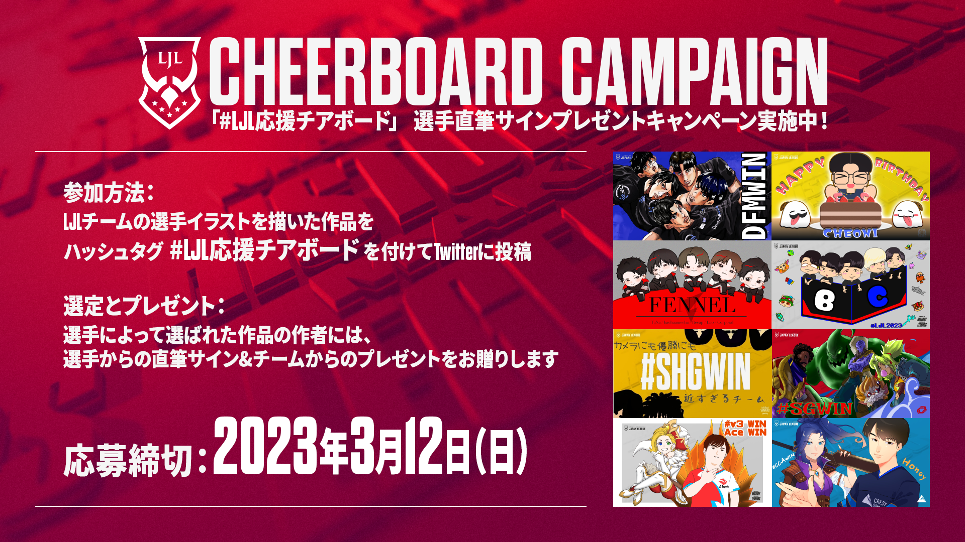 日頃からチアボードイラストで選手を応援してくれるファンのみなさまへの感謝を込めて「#LJL応援チアボード」選手直筆サインプレゼントキャンペーンを3月12日(日)まで実施中です。期間中にご投稿いただいた選手のイラスト作品の中から、LJL 8チームの選手が選んだ作品に直筆サインをして特別なプレゼントとともにお贈りします。
