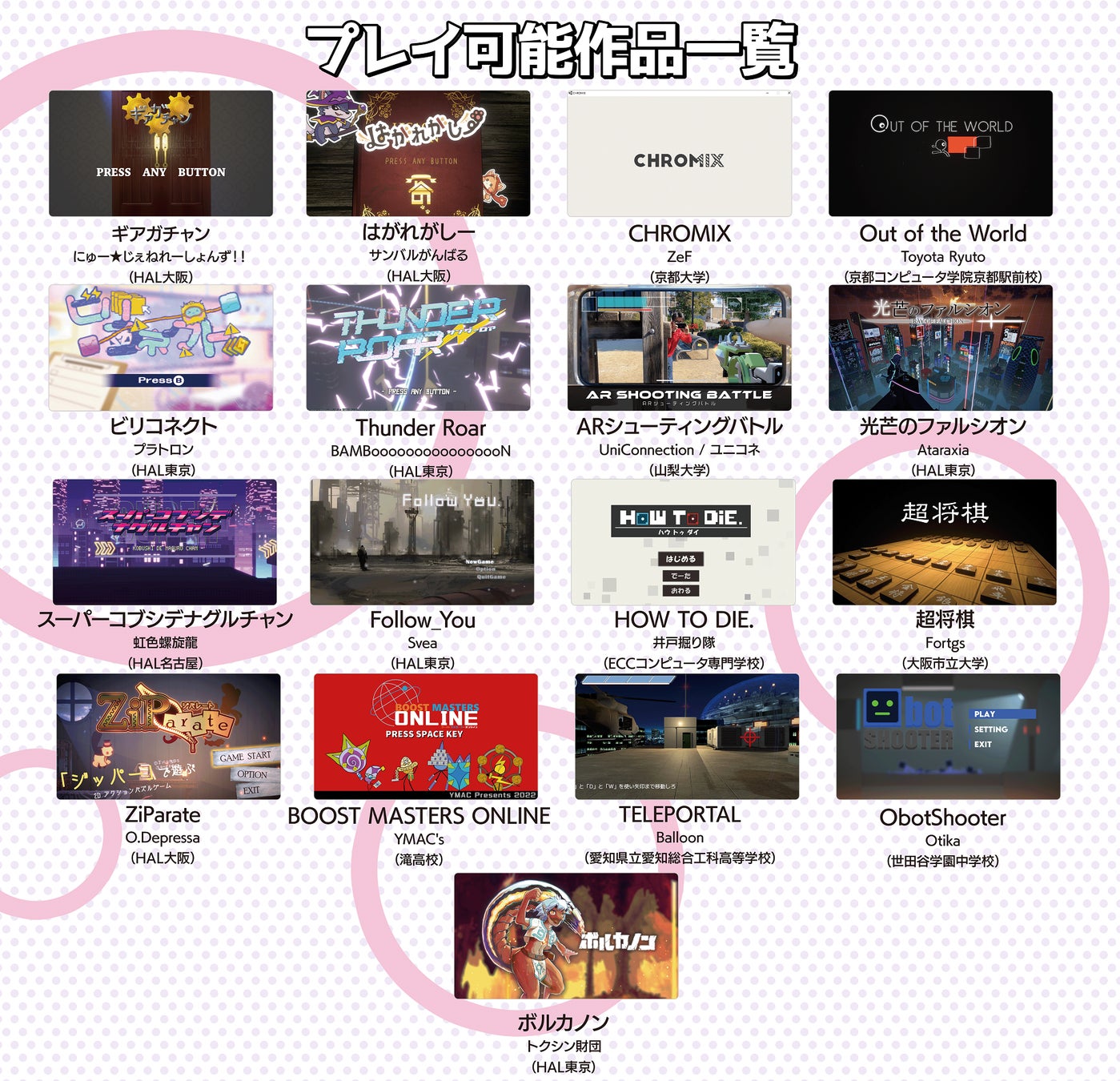 また、ゲームクリエイターズギルドオリジナルグッズの配布も予定しています。出展タイトルにつきましては下記をご確認ください。
