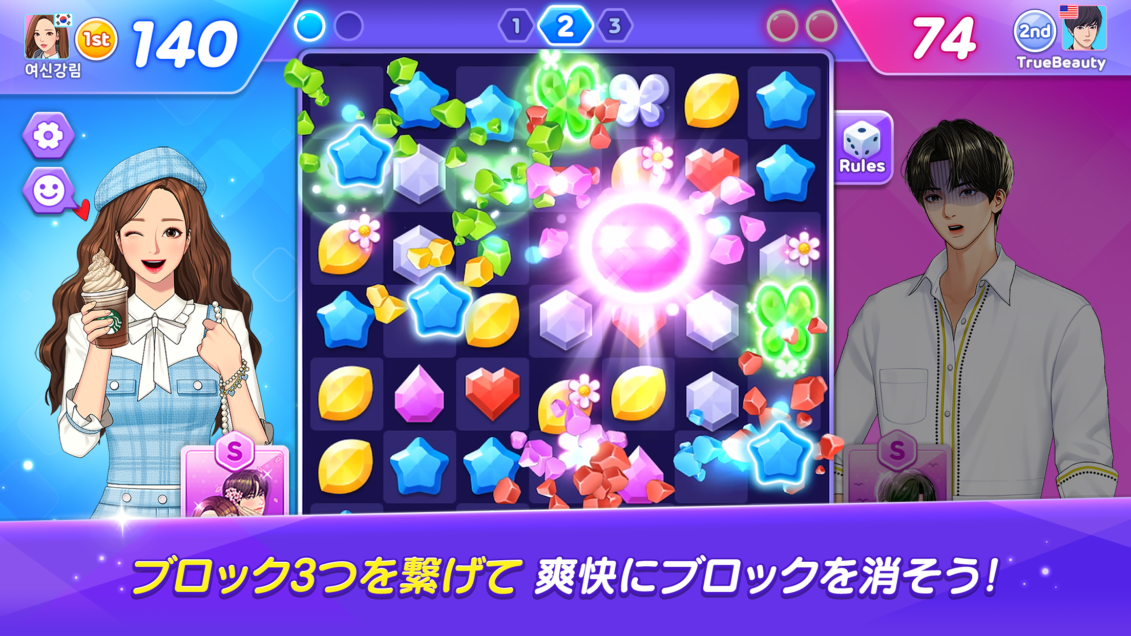 「女神降臨: マッチ3パズル」はLINE StudioがLINEマンガの『女神降臨』をベースに開発したマッチ3 パズルゲームで、よりお楽しみいただくためにユーザー同士の対戦要素を組み合わせているのが特徴です。 同じ色のブロックを3つ以上合わせて爆破する「マッチ3」パズルゲームを『女神降臨』キャラクターでプレイし、世界中のユーザーとの1:1対戦を通じて順位対決ができます。さらに、多彩なメイクアップやコスチュームアイテムを活用したキャラクターのカスタマイズが可能で、LINEマンガでは見られなかった新しいビジュアルを楽しめます。