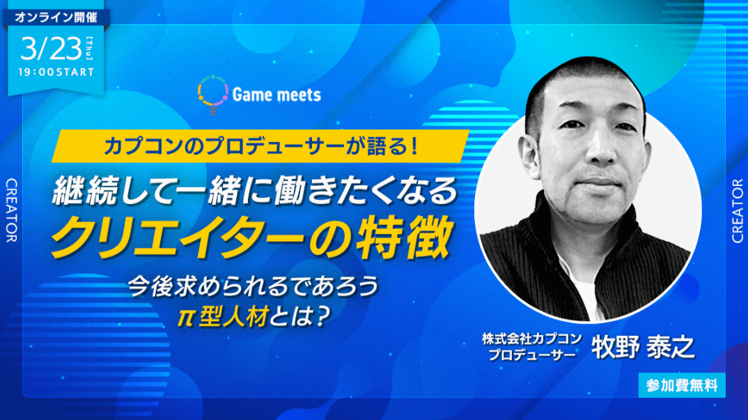 株式会社クリーク・アンド・リバー社(C&R社)が主催するクリエイティブ共創コミュニティ「Game meets」は3月23日(木)、プランナーやデザイナー、プロデューサーなど、ゲーム業界で活躍するクリエイターの方々を対象に、無料のオンラインセミナー「カプコンのプロデューサーが語る!継続して一緒に働きたくなるクリエイターの特徴 〜今後求められるであろうπ型人材とは?〜」を開催いたします。