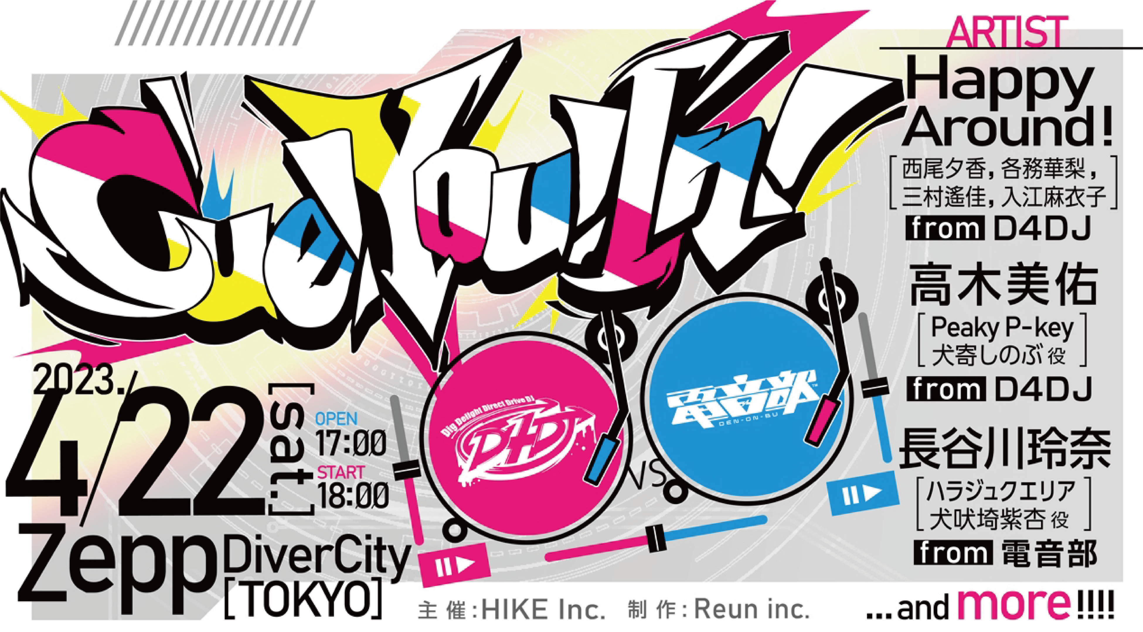 株式会社HIKE(本社:東京都新宿区、代表取締役:三上 政高/梁 俊模)は、4月22日に「Cue! You! In! 〜D4DJ vs 電音部〜」を主催いたします。会場はZepp DiverCtiy(Tokyo)。本公演は株式会社ブシロードが展開するメディアミックスコンテンツ『D4DJ』と株式会社バンダイナムコエンターテインメントが手掛ける音楽原作キャラクタープロジェクト『電音部』の対バンライブとなります。