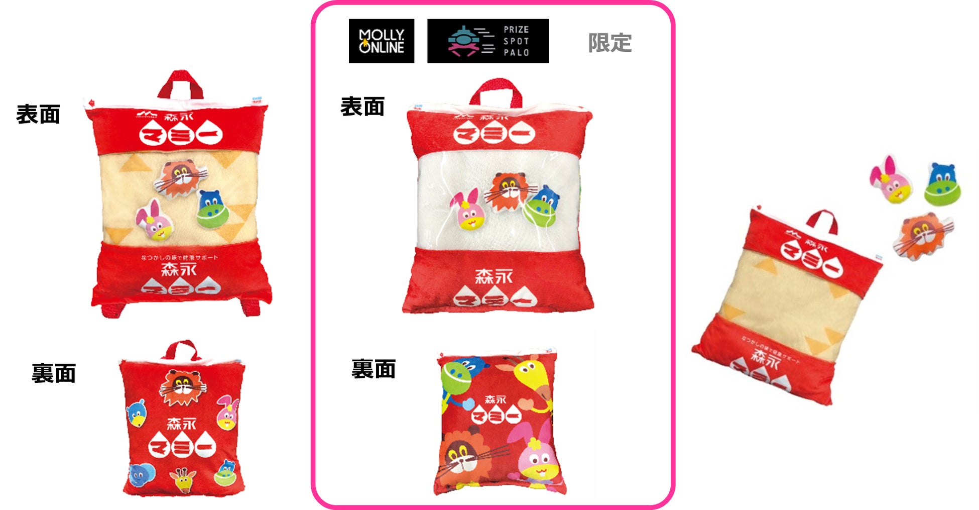 森永乳業完全監修の『森永マミー』のパッケージデザインやキャラクターを使用した当社限定プライズゲーム用景品4アイテム11 種類を展開します。『森永マミー』デザインの「マスコット入りBIGリュック」や「収納BOX」、「マミーポシェット」、「マスコット入りポーチ」が登場するのは今回が初めてで、「収納BOX」は今回のための描き下ろしデザインです。「マスコット入りBIGリュック」ではオンラインクレーンゲーム「モーリーオンライン」・プライズスポットパロ限定で「1990年版の森永マミー」 のデザインをイメージしたリュックも登場します。また、限定カプセルトイでは歴代のパッケージを再現した「ミニチュアキーホルダー」を展開します。