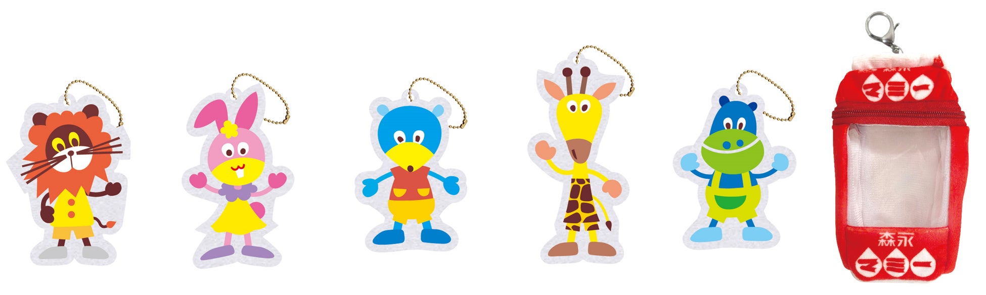 マミーレオ、ピョコリーナ、チャチャクー、ジラッフィー、カバノンのマスコットを入れて持ち歩きができる正面がクリア素材の「森永マミー」型のポーチ