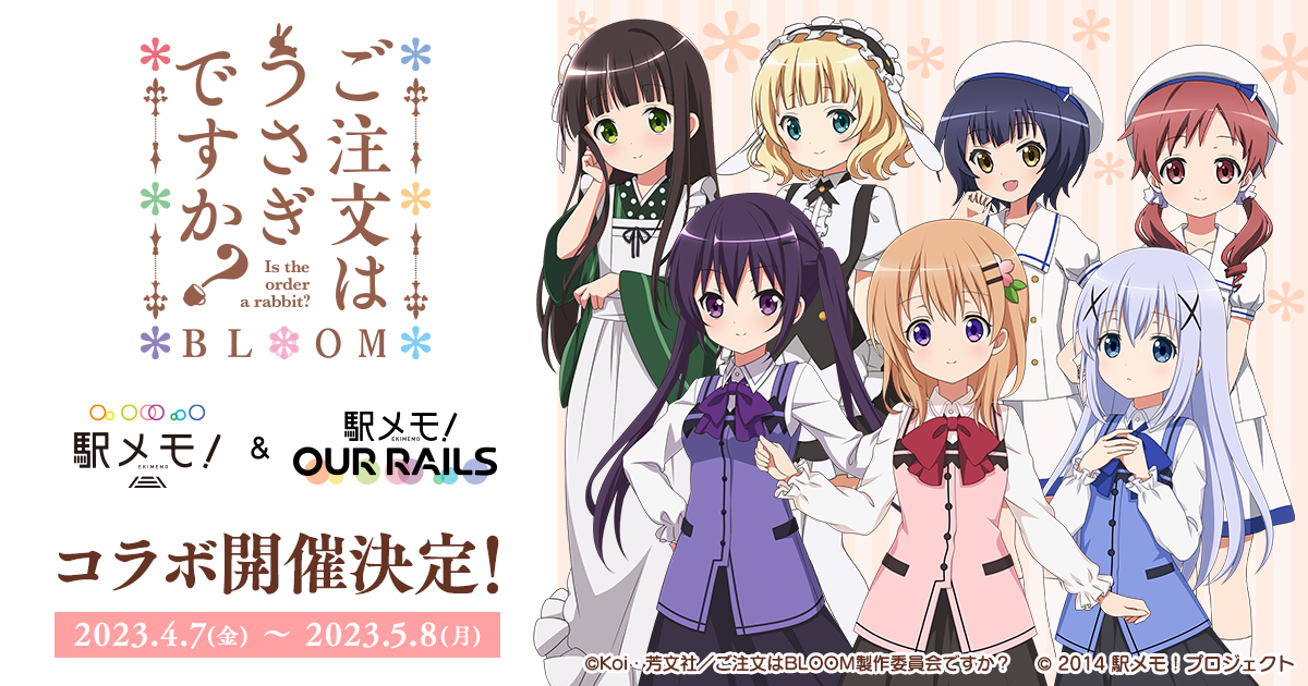 株式会社モバイルファクトリー(本社:東京都品川区、代表取締役:宮嶌 裕二)は、配信中の位置情報連動型ゲーム「ステーションメモリーズ!(略称:駅メモ!)」「駅メモ! Our Rails(略称:アワメモ!)」(以下、「駅メモ!」シリーズ)において、人気TVアニメ「ご注文はうさぎですか? BLOOM」とのコラボキャンペーンを2023年4月7日(金)より開催します。