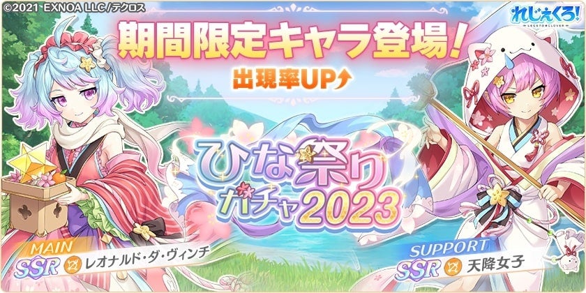 合同会社EXNOA(本社:東京都港区、CEO:村中 悠介、URL:https://games.dmm.com/)が運営するDMM GAMESにおいて、真の英雄となる王道ファンタジー『れじぇくろ!~レジェンド・クローバー~』(https://www.legend-clover.net/)は、期間限定キャラとして、色鮮やかなひな祭り衣装を身にまとった「レオナルド・ダ・ヴィンチ」と「天降女子」が新登場したことを発表した。また、イベント報酬として限定キャラのひな祭り「バッカス」が手に入る新イベントも開催中。さらにリリース500日を記念したガチャやログインボーナスも開催する。