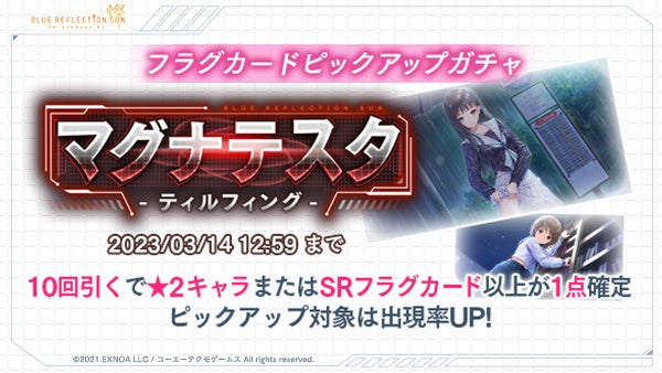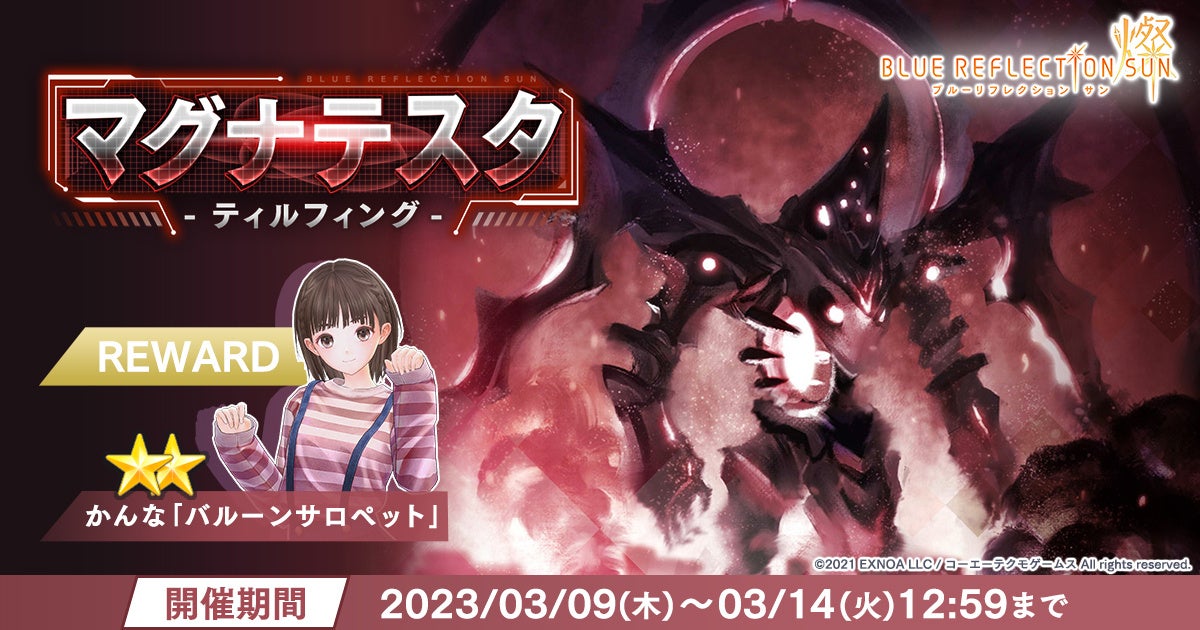 合同会社EXNOA(本社:東京都港区、CEO:村中 悠介、URL:https://games.dmm.com)が運営するDMM GAMESは、スマートフォン/PC向けヒロイックRPG『BLUE REFLECTION SUN/燦』にて、初のマルチレイドバトルイベント「マグナテスタ -ティルフィング-」を2023/03/09(木)に開催することをお知らせいたします。