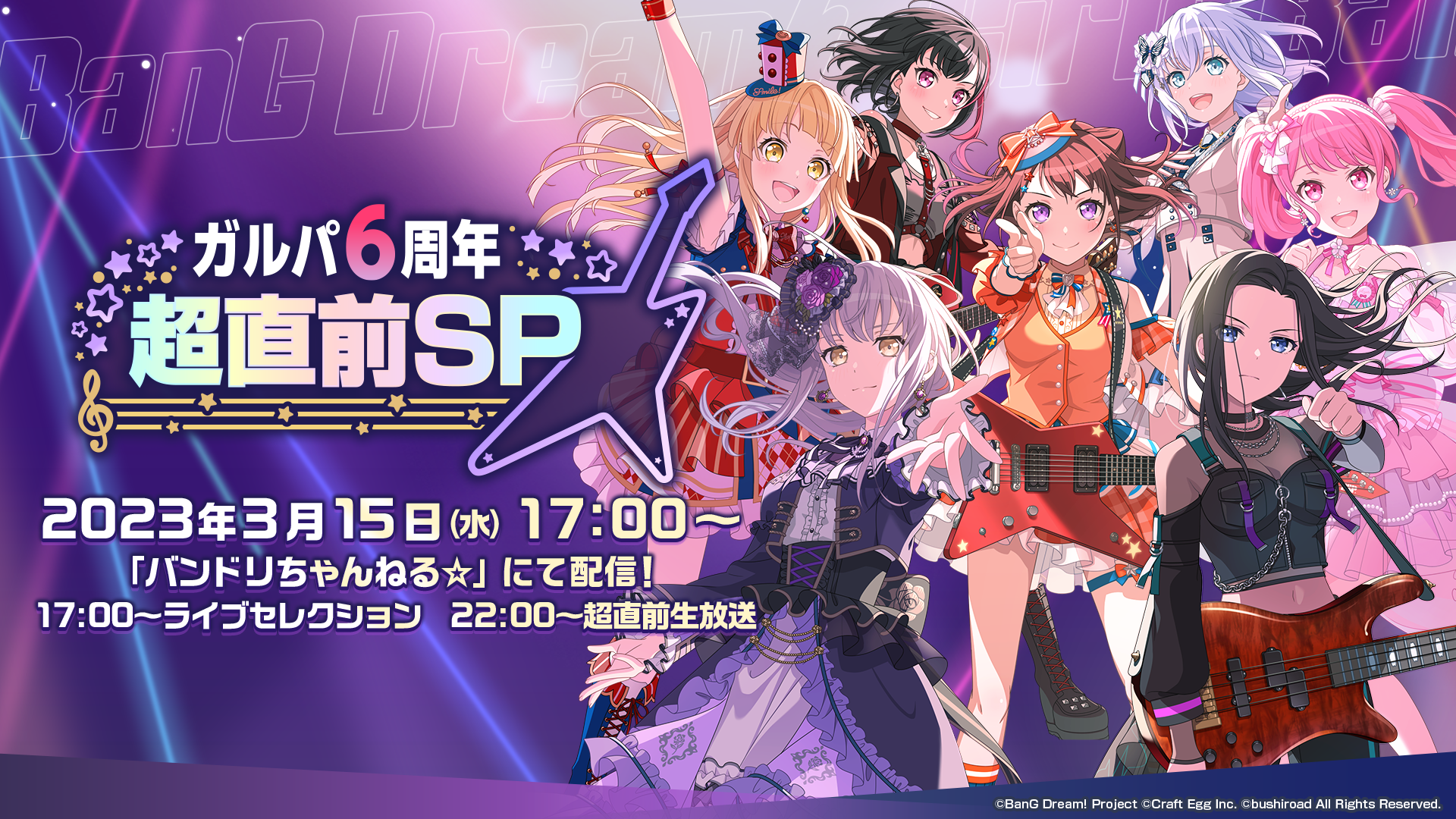 株式会社Craft Egg(本社:東京都渋谷区 代表取締役:森川 修一、以下、Craft Egg)と、株式会社ブシロード(本社:東京都中野区 代表取締役社長:木谷 高明、以下、ブシロード)の共同制作によるスマートフォン向けゲーム「バンドリ! ガールズバンドパーティ!」(以下、ガルパ)は、2023年3月15日(水)17時より配信の「ガルパ6周年超直前SP」にて、過去のライブをダイジェストでお届けする「ライブセレクション」や、6周年をカウントダウンする超直前生放送を放送いたします。ぜひご覧ください。