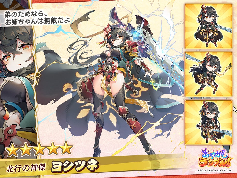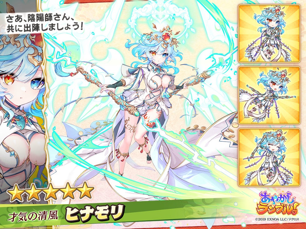合同会社EXNOA(本社:東京都港区、CEO:村中 悠介、URL:https://games.dmm.com/)が運営するDMM GAMESにおいて、あやかし美少女たちと冒険する、迎撃型爽快スキルバトルRPG『あやかしランブル!』(https://ayarabu.jp/)は、3月8日に、新たに「★5 ヨシツネ」「★5 ホロ」を追加したことを発表しました。さらに期間限定「★5 ヒナモリ」も登場中です。