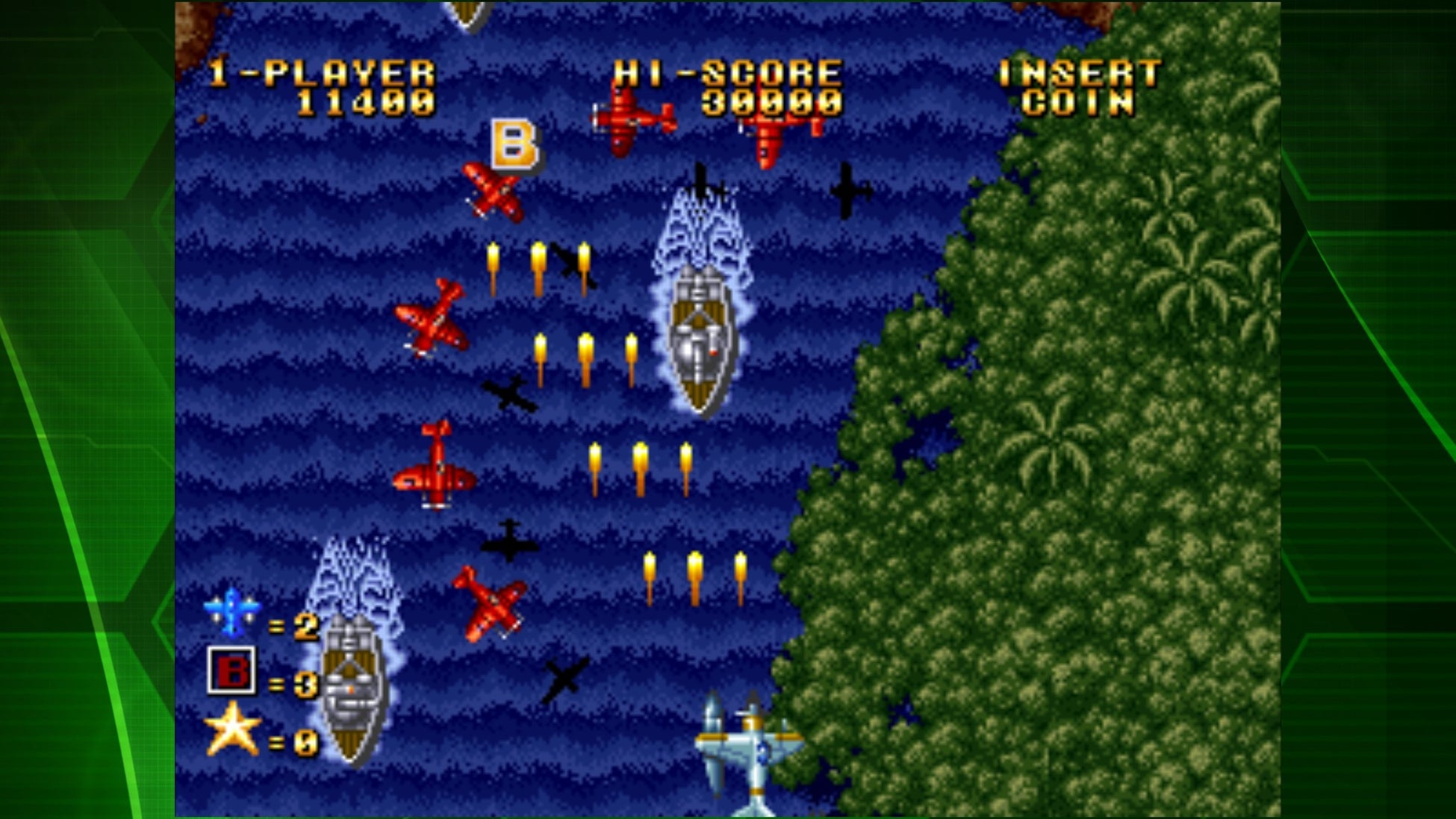 「ゴーストパイロット」は1991年にSNKから発売されたシューティングゲームです。主人公の搭乗する旧式の水上戦闘機を操作して、自機を強化、特殊兵器を使用しながら、2大強国の侵攻から自国を守るために出撃します。超巨大軍事兵器が登場するほか、謎の強大戦闘部隊が登場して白熱の戦いが繰り広げられます。