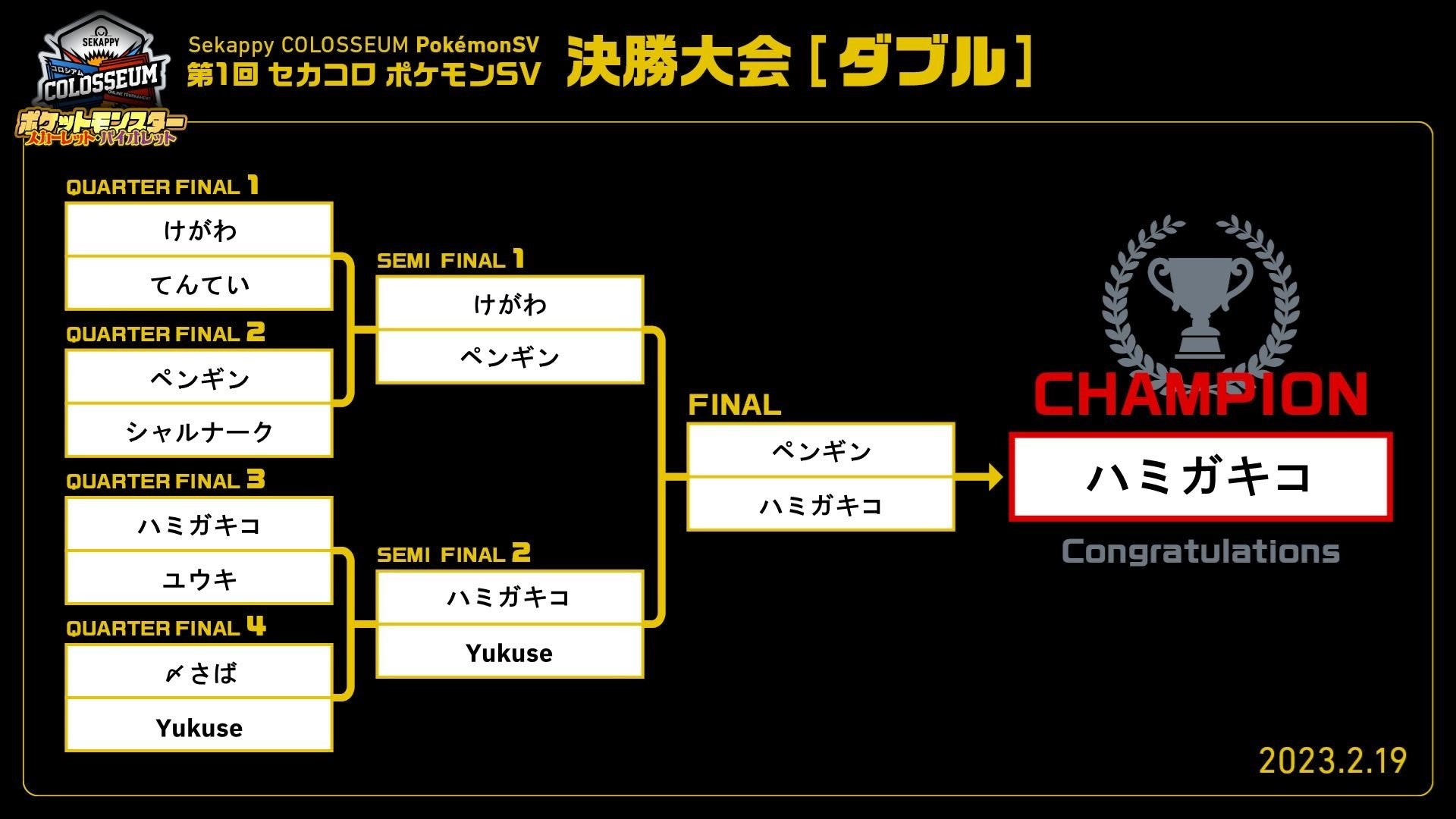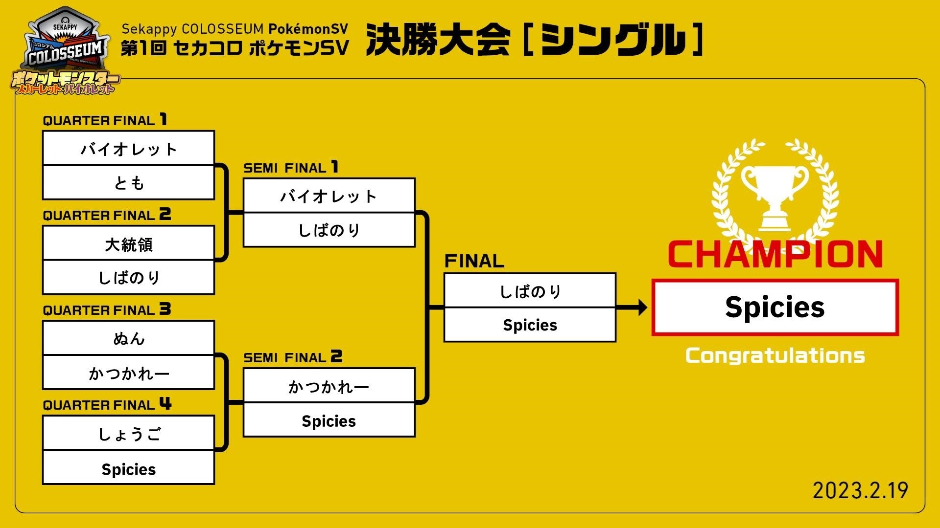 2月19日(日)に行われた「第1回 Sekappy COLOSSEUM ポケモンSV 決勝大会」の試合結果をお知らせいたします。
