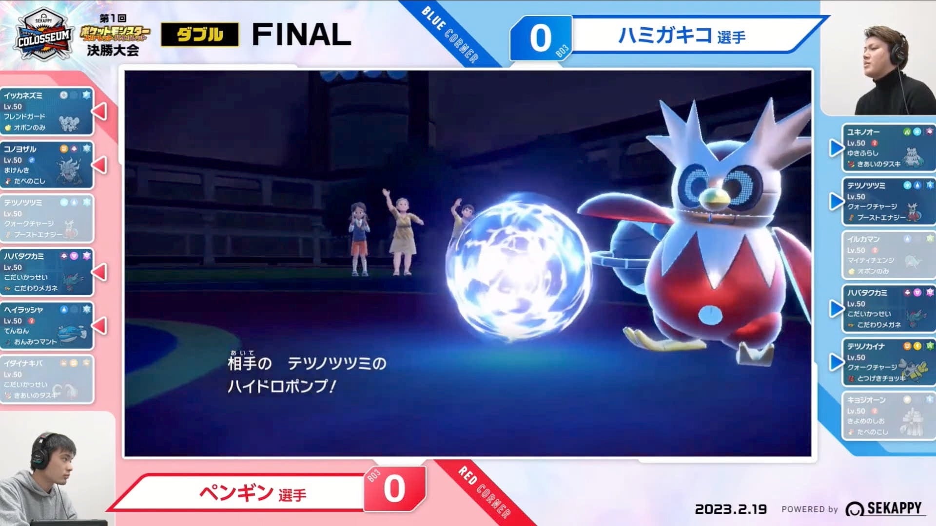 ペンギン選手もイッカネズミの「このゆびとまれ」やヘイラッシャの「あくび」で応戦しますが、テツノカイナによる「ヘビーボンバー」「かみなりパンチ」などの的確な判断やテツノツツミの「ハイドロポンプ」の連続ヒットも後押しして、ハミガキコ選手が1戦目を勝利。ペンギン選手にとっては悔しい内容となった。