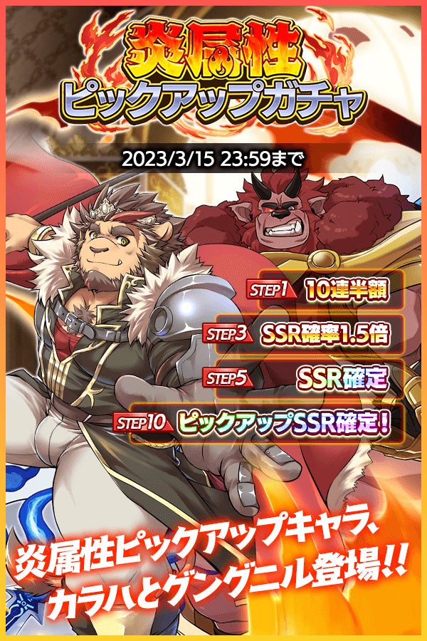 また、炎属性のパーティー強化にぴったりな「炎属性ピックアップガチャ」が開催。ステップアップ形式となっており、STEP5ではSSR1体確定、STEP10ではさらにピックアップ対象が1体確定となっております。