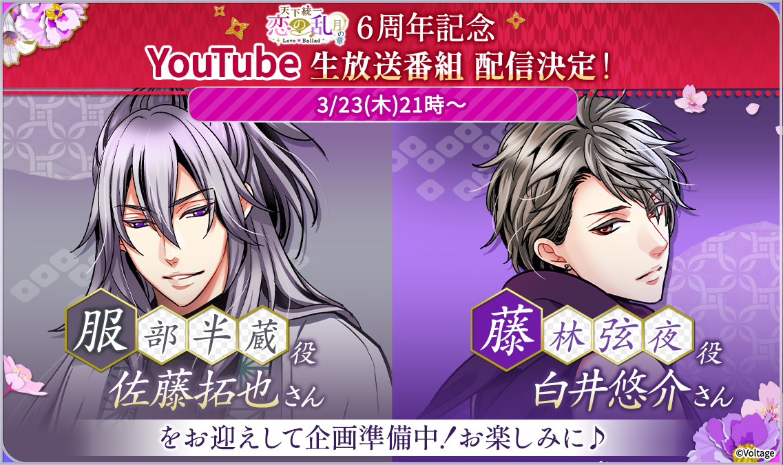 株式会社ボルテージ(本社:東京都渋谷区 代表取締役:津谷 祐司)は、提供中のボル恋人気タイトル「天下統一恋の乱 Love Ballad ~月の章~」の6周年を記念して、公式YouTubeチャンネルにて3月23日(木)に生配信を実施することをお知らせいたします。