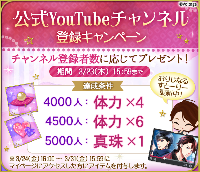 また、現在「恋乱ちゃんねる」では、チャンネル登録キャンペーンも実施しております。登録者数に応じてアプリ内アイテムをプレゼントいたしますので、チャンネル登録がまだお済みでない方はこの機会に登録してお得にアイテムを手に入れてください。