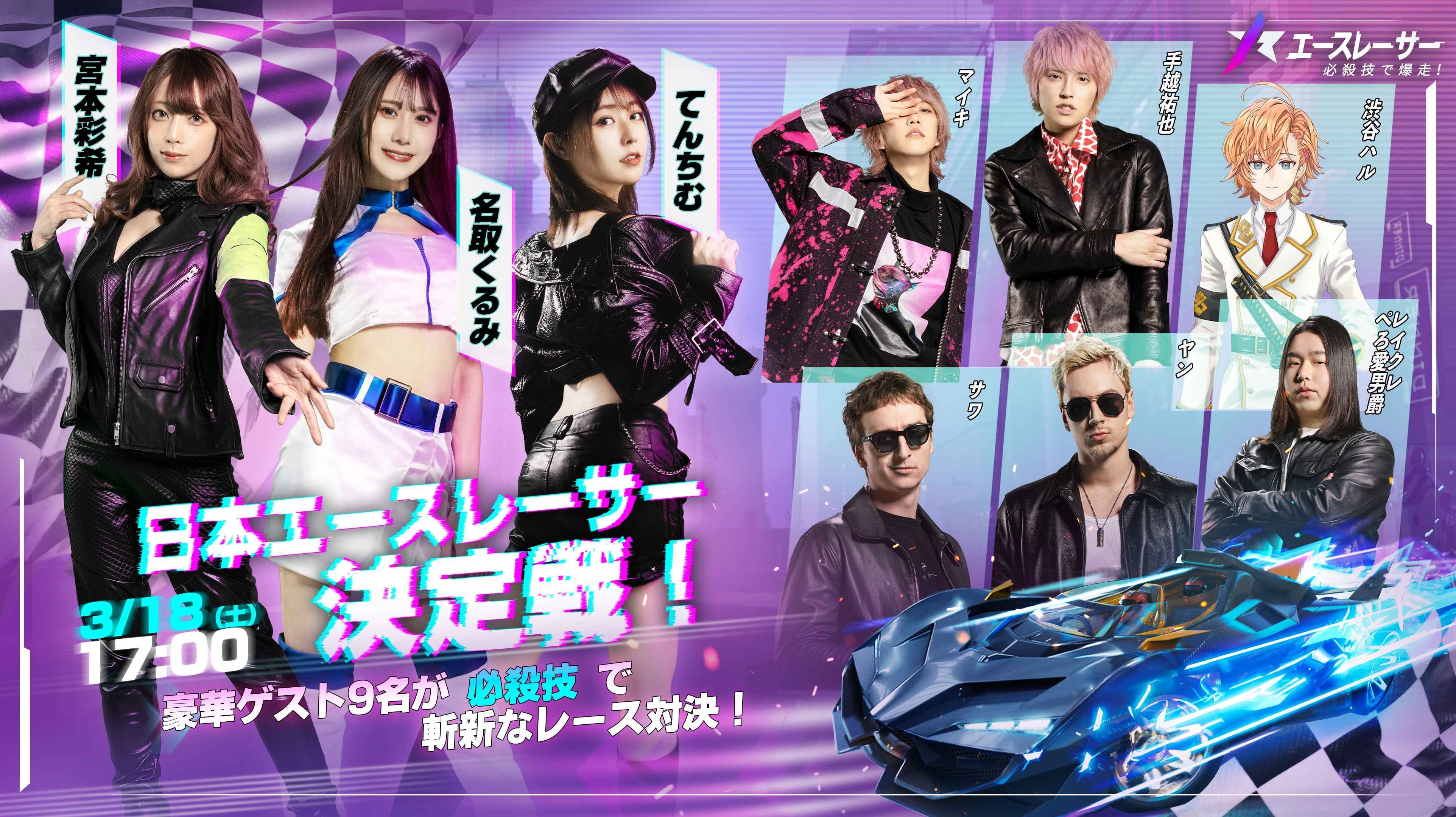『エースレーサー』の日本でのリリースを記念して、「日本エースレーサー決定戦」というキャンペーンが3月18日に行われる予定です。各界隈から合計9名のインフルエンサーの方々にご参加いただき、3名ずつ3チームに分かれてのレース対決を配信で行っていただきます。