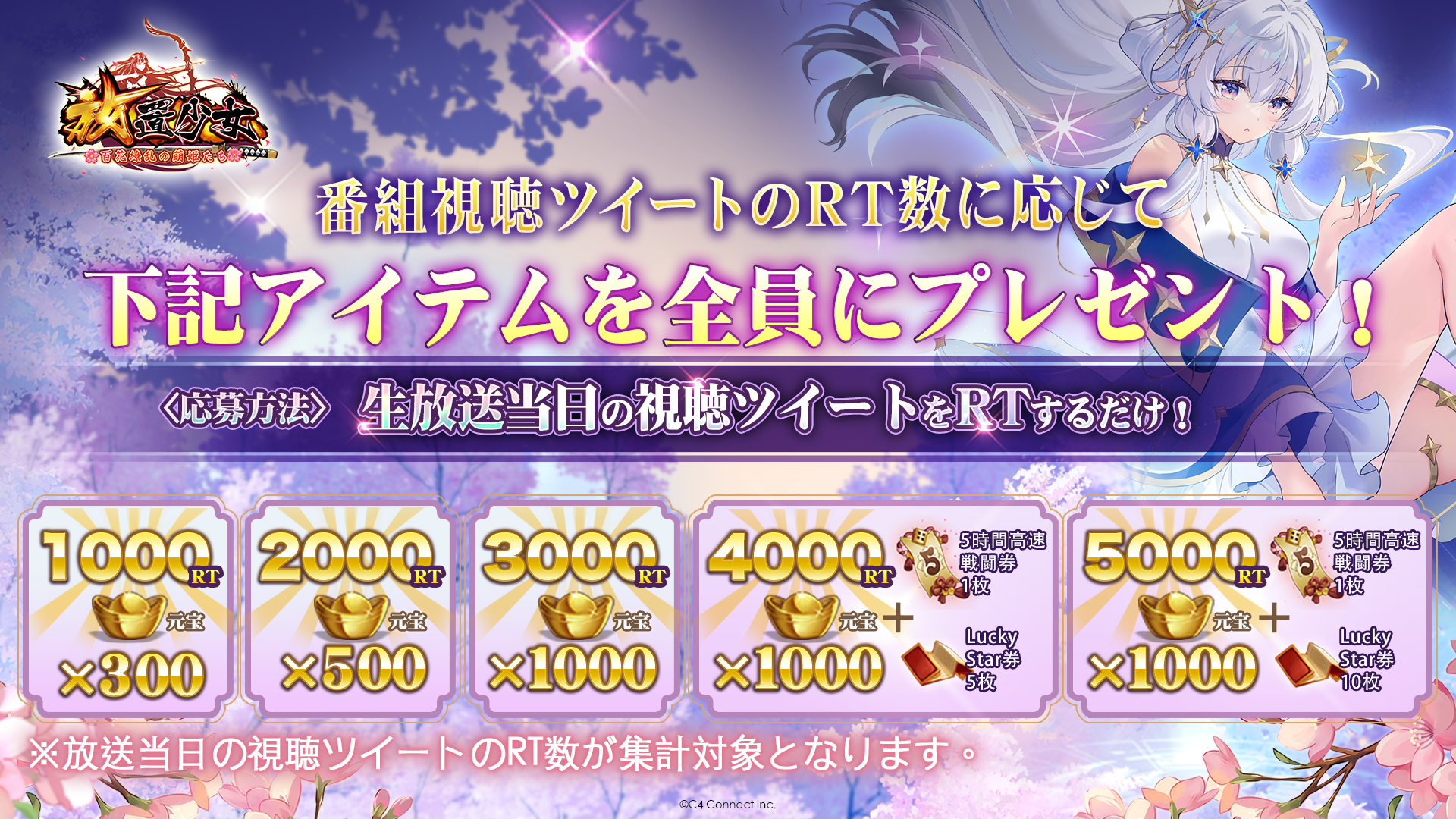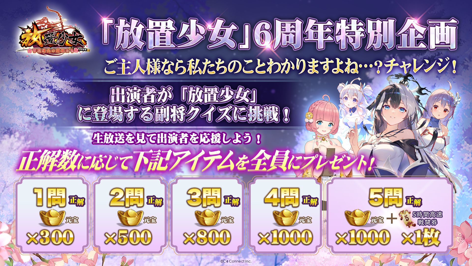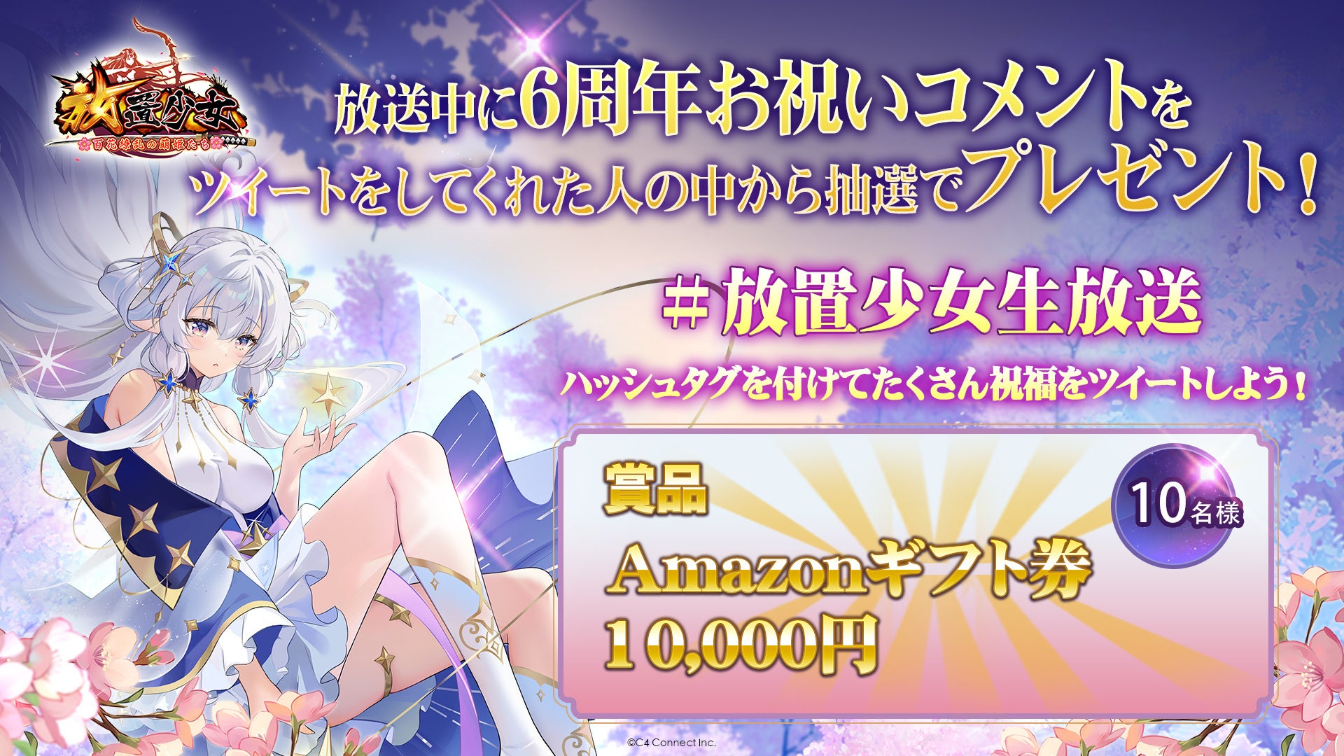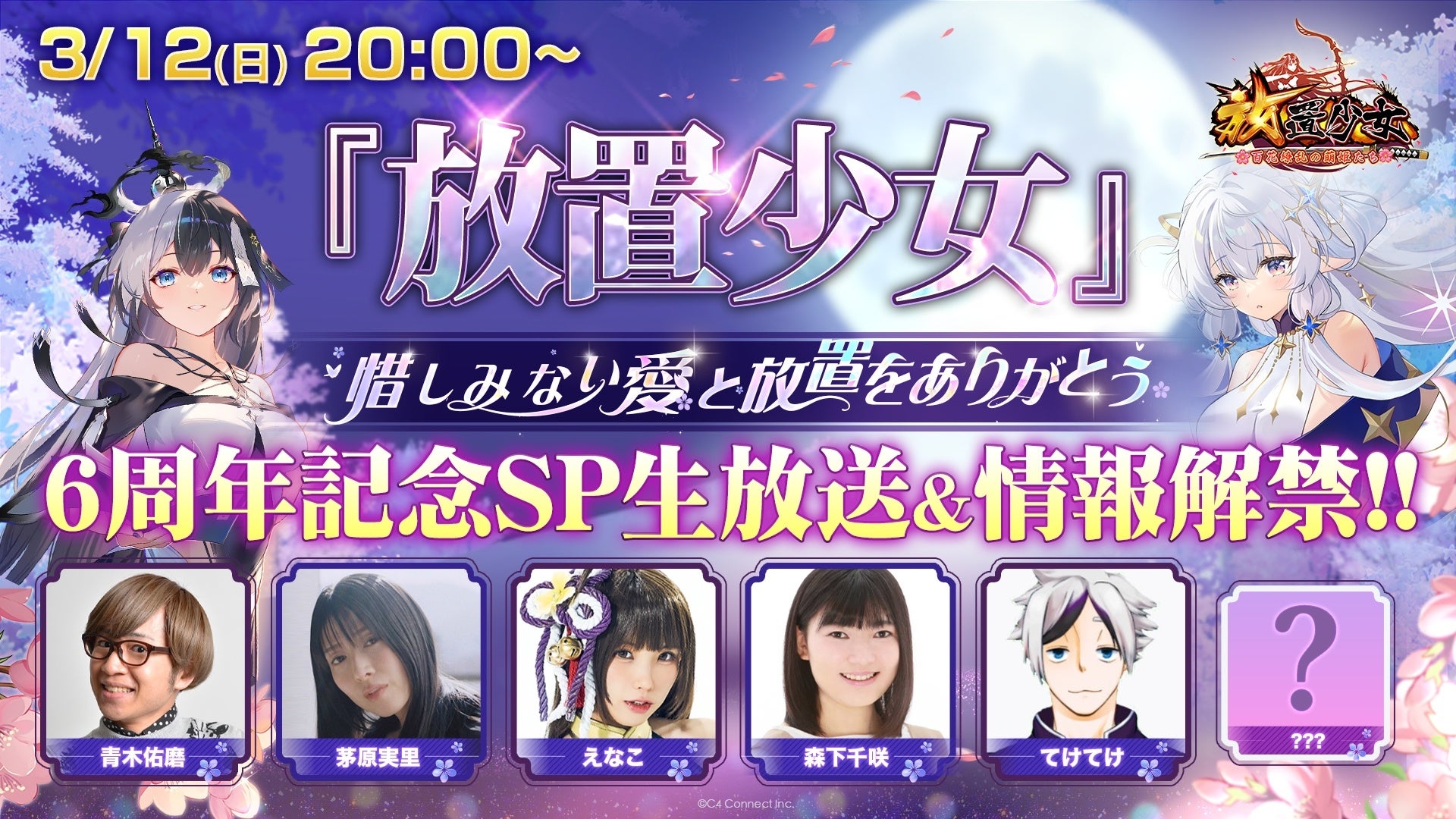 C4 Connect株式会社(本社:東京都渋谷区)は、現在サービス中のスマートフォンアプリ、美少女RPGゲーム『放置少女〜百花繚乱の萌姫たち~』(以下、『放置少女』)が3月12日(日)20時より「惜しみない愛と放置をありがとう」と題した生放送を配信することをお知らせいたします。