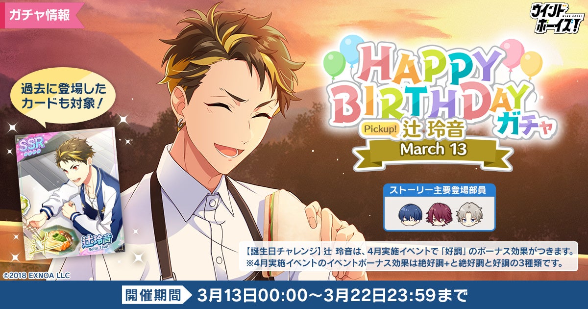 合同会社EXNOA(本社:東京都港区、CEO:村中 悠介、URL:https://games.dmm.com/)が運営するDMM GAMESは、生徒と奏でる青春育成ゲーム『ウインドボーイズ!』において、2023年3月13日(月)より、「Happy Birthday 辻 玲音 ガチャ」と誕生日セットの販売を開始しました。また、開催中のキャンペーンについてもお知らせします。