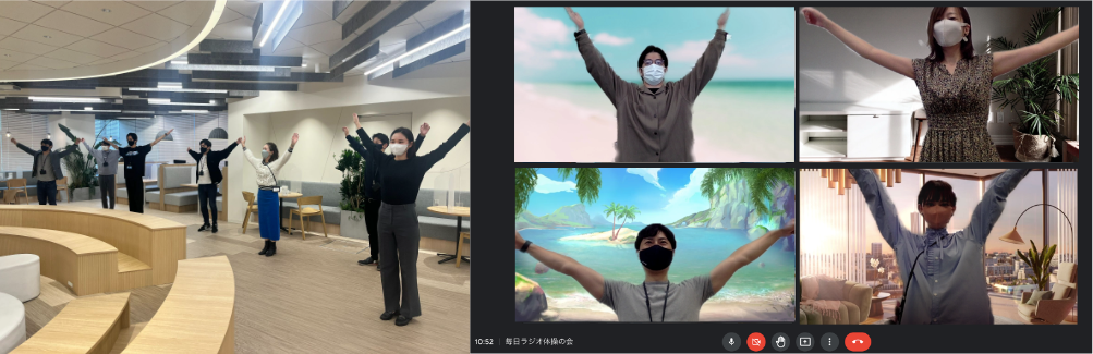 部活動の一つでもあるラジオ体操部と人事部門が連携し、社内で毎日ラジオ体操を実施しています。出社している人だけでなく、在宅勤務者もオンラインでつながり参加しています。 ラジオ体操の継続的な実施により、参加者からは「毎日継続することで代謝が上がり、悩んでいた肩こりが軽減された」「オンラインでも参加できるので、毎朝みんなと顔を合わせて健康を意識する習慣ができた」「みんなの士気が高まった」などの声が寄せられ、従業員の健康増進につながっています。
