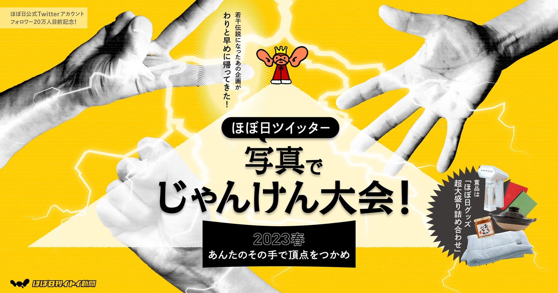 2022年12月、WEBサイト「ほぼ日刊イトイ新聞」が、おそらく世界で初めて開催した「ツイートされた写真をつかったじゃんけん大会」。ドラマティックな死闘を収めた4時間(!)の配信となり、動画を観て、「私も参加したかった!」と思った方も、意外と多いようなので、わりと早めに第2回の開催が決まりました。参加方法はシンプル。3月20日(月)正午(12時)までに、ほぼ日の公式ツイッターアカウント( https://twitter.com/1101complus )をフォロー、「#ほぼ日じゃんけん」のハッシュタグをつけて、「グー・チョキ・パーのいずれかを写真でツイート」してください。それをほぼ日のスタッフが人力で対戦させ、勝ち残ったひとりが豪華賞品総取りとなります! ツイートされた写真と添えられたひと言で、「妙にいい!」というものには勝ち負けを無視して、特別賞もさしあげます。本番の対戦は2023年3月21日(火・祝)13時から生配信。ぜひご参加ください。参加方法など詳細: https://www.1101.com/n/s/twitter_janken2023ss/index.html
